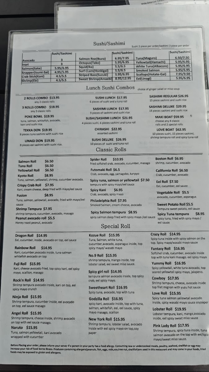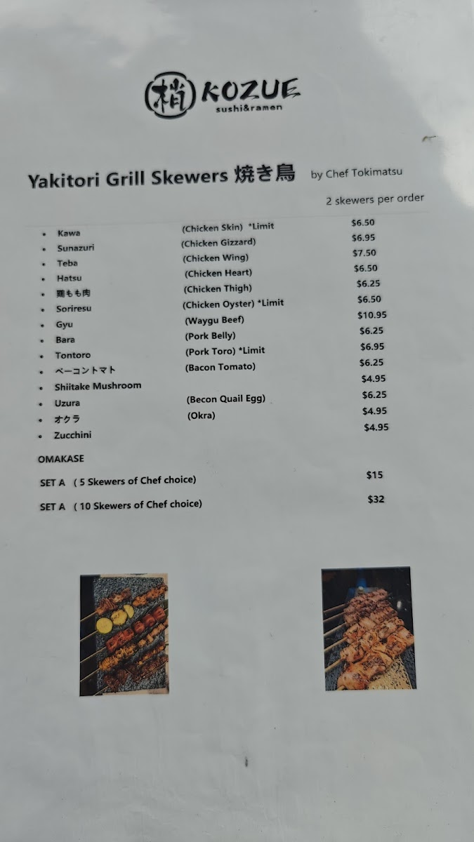The lunch menu also features other favorites like Tempura Udon, Shrimp Yakisoba, and Kozue Fried Rice for those who prefer hot dishes. For a lighter bite, their sushi starters include options like Sushi Appetizer, Sashimi Appetizer, Yellowtail Jalapeno, and Beef Tataki.