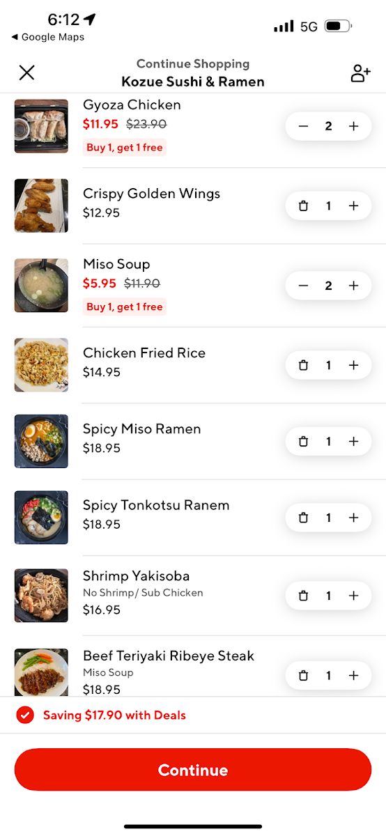 At Kozue Sushi & Ramen, the menu offers a wide variety of delicious options, catering to a range of tastes and preferences. If you're visiting during Krazy Hour, you can enjoy a 30% discount on starters, including Korokee, Shumai, Harumaki, Crispy Golden Wings, and Chicken Karaage, perfect for sharing or starting your meal off right. The classic rolls like Salmon Roll, Tuna Roll, Yellowtail Roll, and the crispy Crispy Crab Roll are also available at a discounted price, offering a great mix of traditional and inventive sushi options.